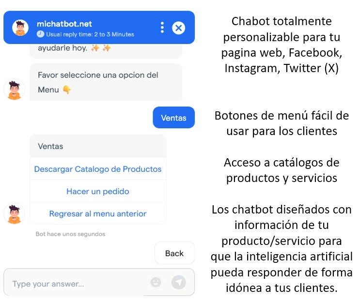 Escoge el ChatBot que mejor se adapte a tu empresa, ya sea a tu pagina web, para uso en WhatsApp Business, o si lo prefieres para usar en Messenger de Facebook, o el ChatBot para Instagram.